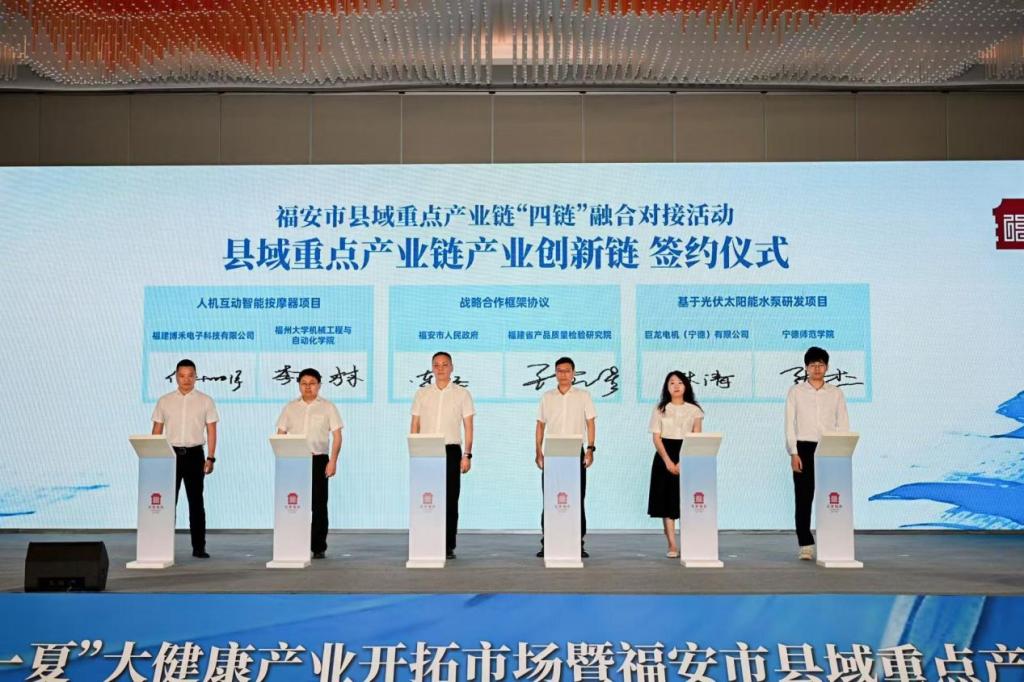 6月6日,“全家福安・健康一夏”大健康产业开拓市场暨福安市县域重点产业链“四链”融合对接会在东百假日酒店举行。此次活动由福安市政府牵头,聚焦电机电器、不锈钢等重点产业链,以“产业链、创新链、资金链、人才链” 四链融合为核心,旨在通过政产学研用协同创新,破解产业技术瓶颈、拓展市场发展空间。我院张杰老师代表院方出席,在县域重点产业链产业创新链签约仪式上,与巨龙电机(宁德)有限公司就“基于光伏太阳能水泵研发项目”完成产学研合作签约。该项目既助力福安市电机电器产业与高校创新资源深度融合,为产业创新发展注入新动能,又推动学院学科建设与地方产业需求深度适配,促进“产教融合”人才培养模式深化。