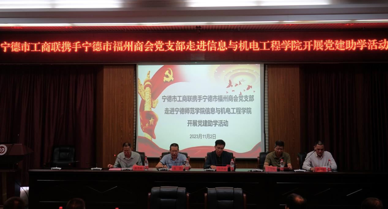 2023年11月2日,宁德市工商联携手宁德市福州商会党支部走进宁德师范学院信息与机电工程学院开展党建助学活动在行政楼三楼会议室召开。宁德市委统战部副部长徐燕蕴、宁德市工商联副主席陈忠、宁德市福州商会会长周仲生、宁德师范学院学院学工处处长毛茂峰以及宁德市福州商会党支部党支部企业家代表等领导共计60人出席了捐资助学仪式。