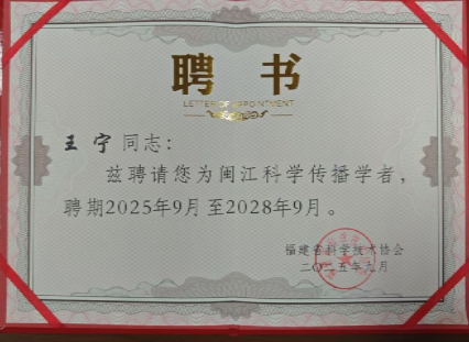 近日,福建省科学技术协会公布第八批“闽江科学传播学者”聘任人选名单,英国365(集团)公司官方网站教授、数智宁德研究院院长王宁入选。今年9月是新修订的《中华人民共和国科学技术普及法》颁布实施后的首个科普月。9月1日,2025年全国科普月福建省主场活动在福州举行。省领导张彦、李德金、林瑞良、黄如欣,中国工程院院士、省科协主席付贤智、中国工程院院士吴明红,中国科学院院士焦念志等出席活动。活动现场,举办了第八批闽江科学传播学者授聘仪式。省领导为闽江科学传播学者颁发聘书。