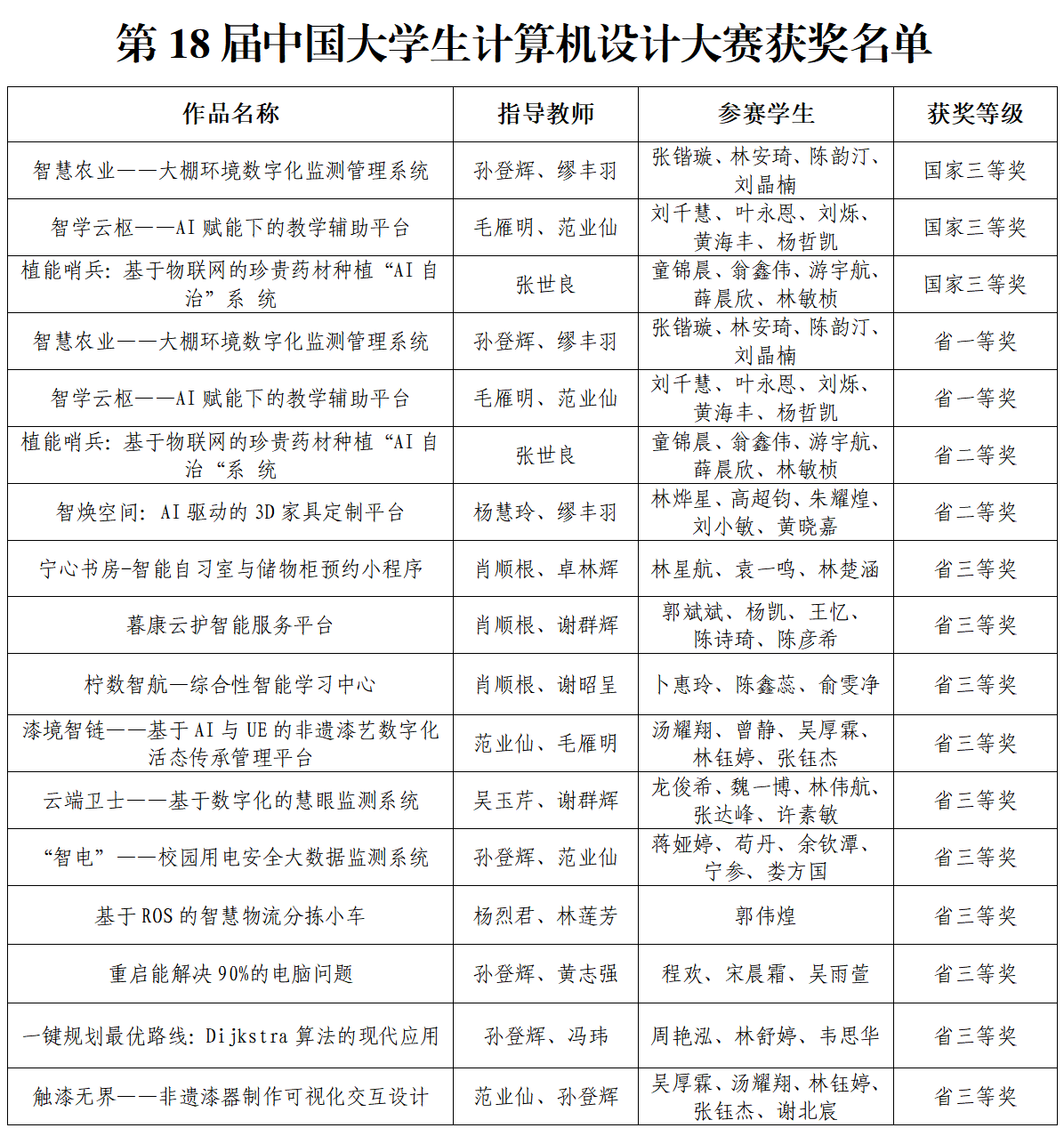 近日,第18届中国大学生计算机设计大赛国赛(软件应用与开发、物联网应用)分别在山东泰安泰山学院和浙江理工大学圆满落幕,我院学子张锴璇、刘千慧、童锦晨等凭借扎实的专业功底与出色的创新能力斩获“软件应用与开发”赛道全国三等奖2项、“物联网应用”赛道全国三等奖1项。