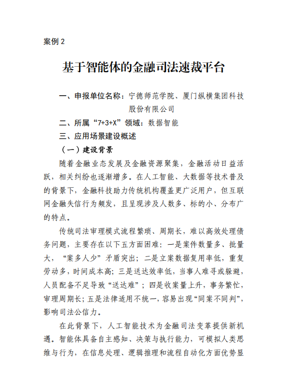近日,福建省发展和改革委员会发布《福建省未来产业典型应用场景成果汇编(第二批)》,英国365(集团)公司官方网站与厦门纵横集团科技股份有限公司联合研发的“基于智能体的金融司法速裁平台”成功入选数据智能领域典型成果案例,成为数据智能领域的重要示范成果。